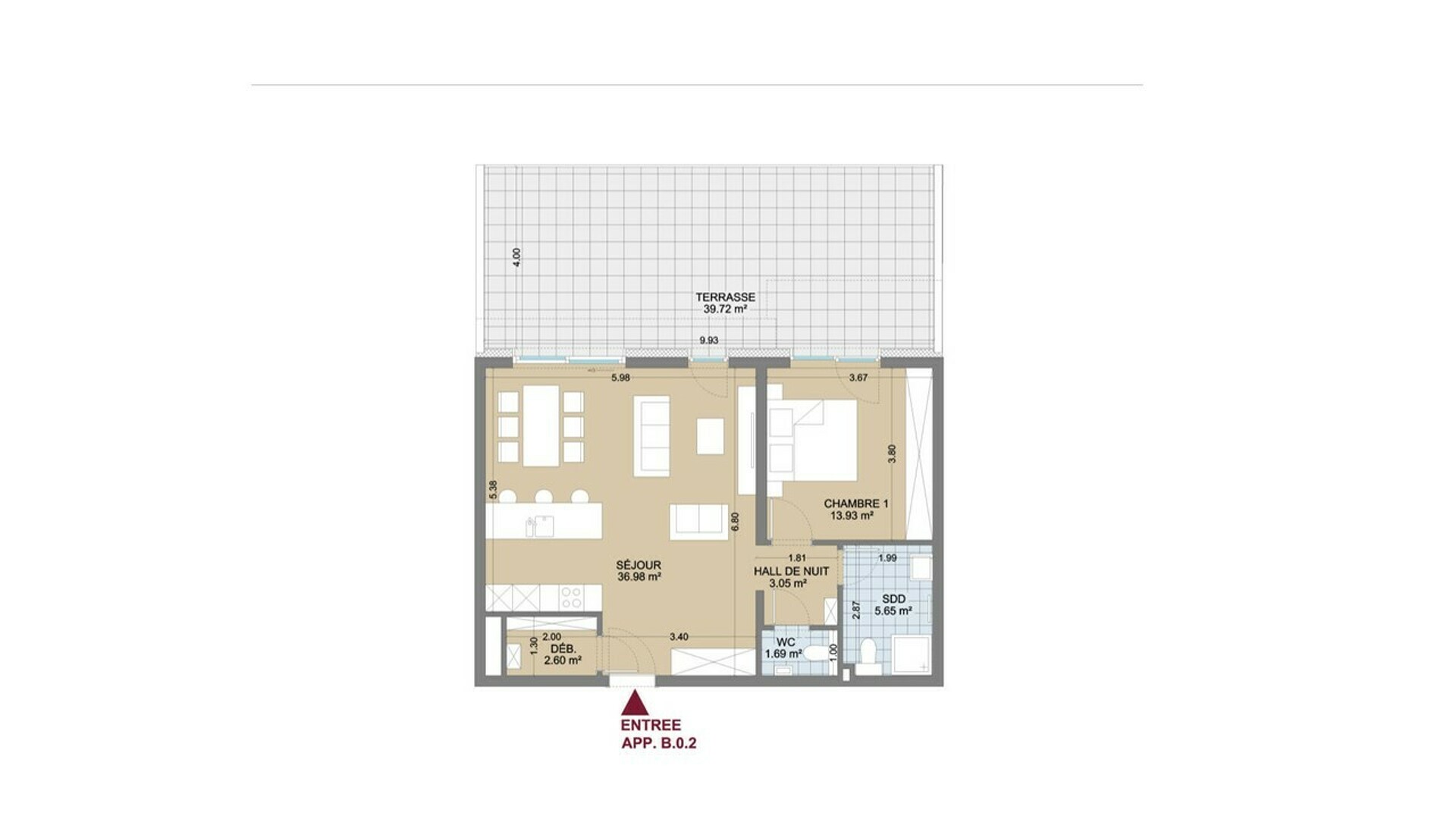 Appartement n° B.0.2 (lot 048) neuf au rez-de-chaussée du Bloc B avec une surface habitable de +/- 65,48 m2 se composant comme suit : d'un débarras, d'une cuisine à équiper ouverte sur un vaste séjour de +/- 36,98 m2 avec accès à une terrasse de +/- 39,72 m2 et à un jardin/verdure de +/- 109,54 m2, d'un hall de nuit desservant 1 WC séparé, une salle de douche avec WC (+/- 5,65 m2) et 1 chambre à coucher (+/- 13,93 m2) donnant sur la terrasse et le jardin également.
