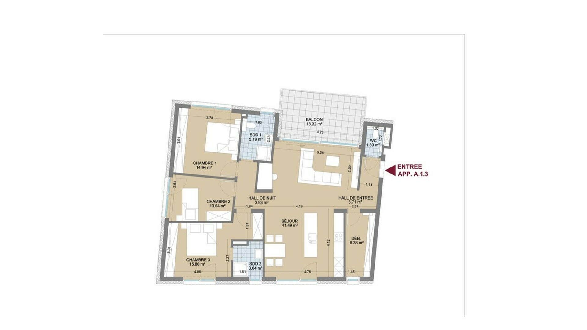 Appartement n° A.1.3 (lot 056) neuf au 1er étage du bloc A avec une surface habitable de +/- 111,25 m2 se composant comme suit : d'un hall d'entrée, d'un WC séparé, d'un débarras (+/- 6,38 m2), d'une cuisine à équiper ouverte sur un vaste séjour de +/- 41,49 m2 avec accès à un balcon de +/- 13,41 m2, d'un hall de nuit desservant 2 salles de douche, une avec WC (+/- 5,19 m2) et une sans WC (+/- 3,64 m2), de 3 chambres (+/- 10,04 m2, 14,94 et +/- 15,80 m2).