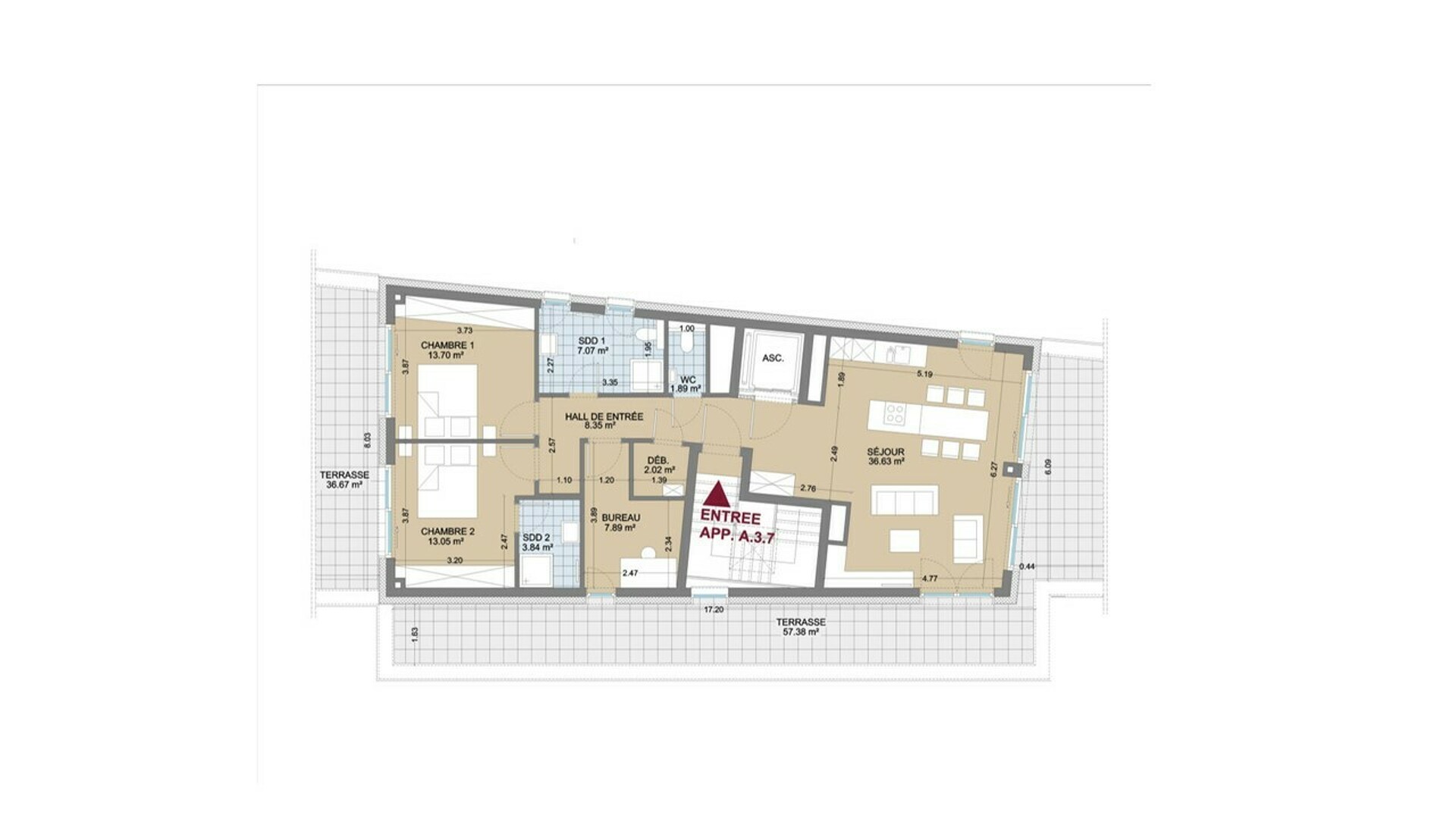 Penthouse n° A.3.7 (lot 061) neuf au 3ème étage et dernier étage du Bloc B avec une surface habitable de +/- 97,73 m2 et accès direct par l'ascenseur se composant comme suit : d'un hall d'entrée, d'une cuisine à équiper ouverte sur un vaste séjour de +/- 36,63 m2 avec accès à une 1ère terrasse de +/- 57,37 m2, d'un débarras, d'un bureau (+/- 7,89 m2), d'un WC séparé, de 1 salle de douche (+/- 7,07 m2), d'une 1ère chambre +/- 13,70 m2) avec accès à une 2ème terrasse (+/- 34,67 m2), d'une 2ème chambre (+/- 13,05 m2) avec sa salle de douche (+/- 3,84 m2) et également accès à la terrasse de +/- 34,67 m2.