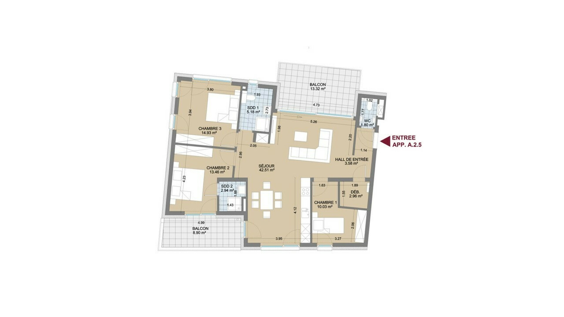 Appartement n° A.2.5 (lot 060) neuf au 2ème étage du Bloc A avec une surface habitable de +/- 100,98 m2 se composant comme suit : d'un hall d'entrée, d'un WC séparé, d'un débarras, d'une première chambre à coucher (+/- 10,03 m2), d'une cuisine à équiper donnant sur le balcon de +/- 8,78 m2 ouverte sur un vaste séjour de +/- 42,51 m2 avec accès à un 2ème bacon de +/- 13,32 m2, d'une salle de douche avec WC (+/- 5,18 m2), de 2 chambres à coucher (+/- 14,93 m2 et +/- 13,46 m2) dont la plus petite donne sur le balcon de +/- 8,78 m2 et bénéficie de sa propre salle de douche.