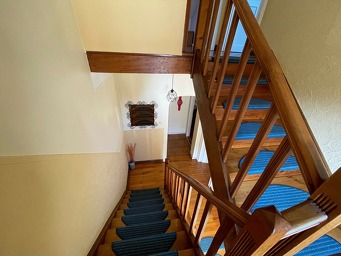 Un escalier en bois nous conduit au 1er étage où un hall de nuit dessert deux chambres et une salle de bain.