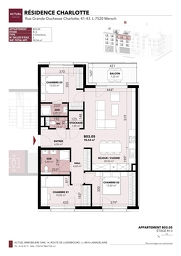 Appartement neuf n° B 03-05 d'une superficie de +/- 90,54 m2 avec 1 balcon (+/- 7,22 m2) au 3ème étage du bâtiment B de cette nouvelle résidence "CHARLOTTE" composée de 15 appartements et d'un local commercial répartis sur 2 bâtiments distincts et située au cœur de la ville de Mersch, proche des transports en commun, des commerces et de toutes les commodités urbaines.