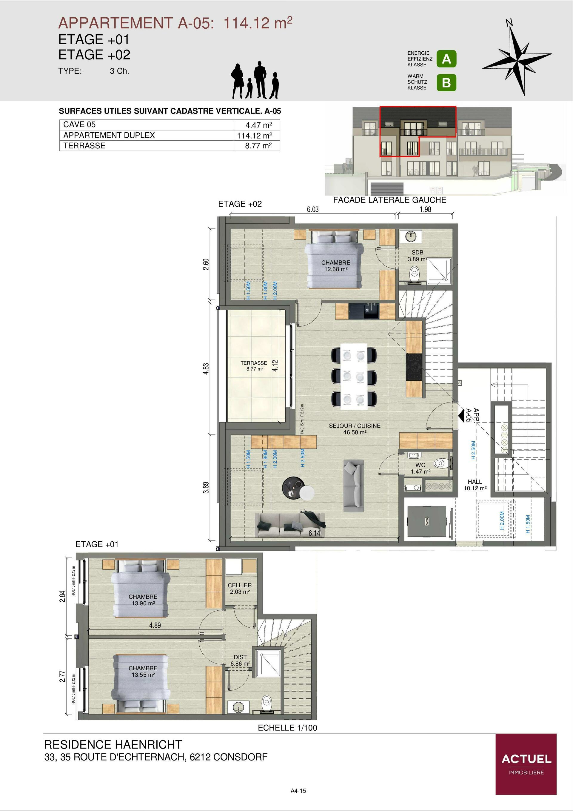 Appartement duplex neuf n° A-05 d'une superficie de +/- 114,12 m2 avec une terrasse de +/- 8,77 m2 au 1er et 2ème étage du bâtiment A de cette nouvelle résidence "HAENRICHT" composée de 12 appartements, située à Consdorf offrant un cadre de vie idéal à ses futurs habitants à la recherche à la fois de tranquillité dans un environnement paisible et verdoyant mais proche de toutes les commodités urbaines.