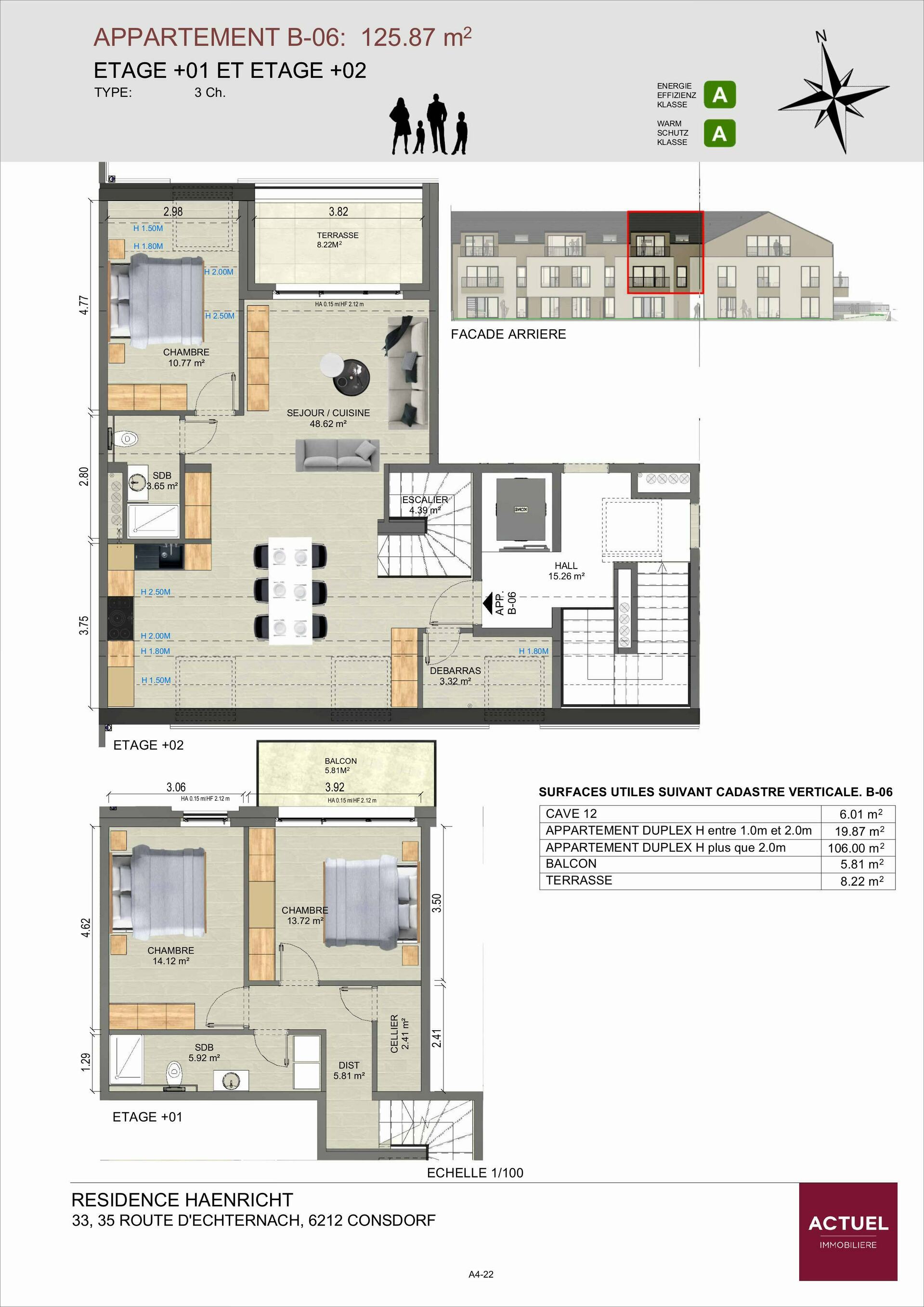 Appartement duplex neuf n° B-06 d'une superficie de +/- 125,87 m2 avec une terrasse de +/- 8,22 m2 et un balcon de +/- 5,81 m2 au 1er et 2ème étage du bâtiment B de cette nouvelle résidence "HAENRICHT" composée de 12 appartements, située à Consdorf offrant un cadre de vie idéal à ses futurs habitants à la recherche à la fois de tranquillité dans un environnement paisible et verdoyant mais proche de toutes les commodités urbaines.
