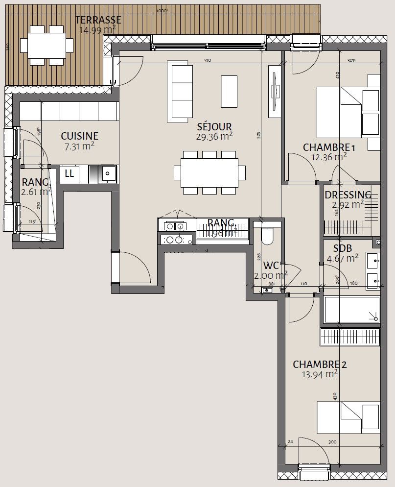 The apartment consists of an entrance hall, a kitchen to be fitted with a storage room, open to a spacious living room with access to a terrace of approximately 14.99 m², a separate toilet, and a night hall leading to 2 bedrooms, one of which includes a dressing room, and a bathroom.