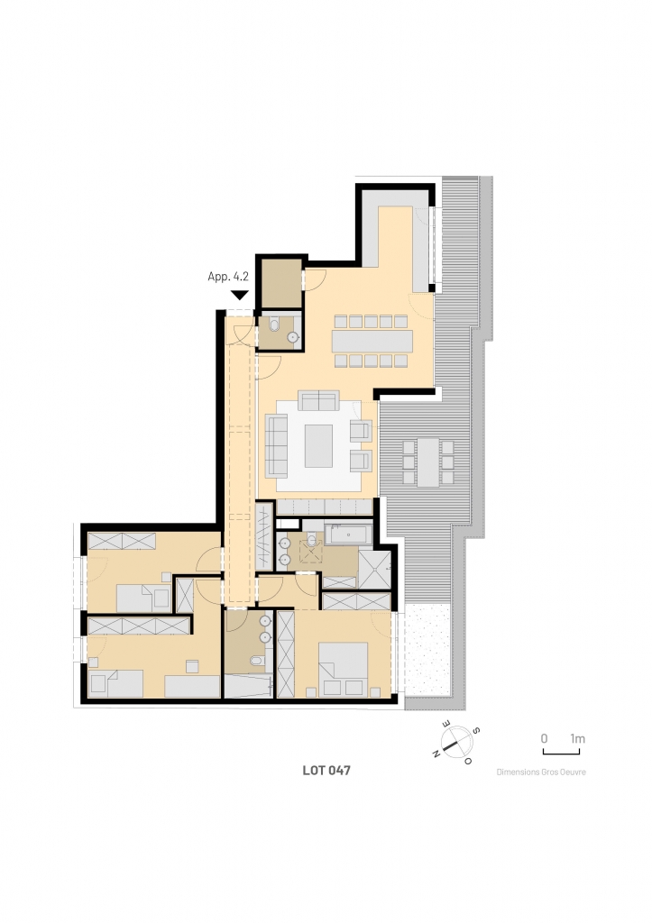 Penthouse 4.2 (lot 047) neuf situé au quatrième étage avec une surface habitable de +/- 137,36 m2 se composant comme suit: d'un hall d'entrée, d'un hall de nuit, trois chambres à coucher, deux salles de douche, d'un vaste living avec une cuisine ouverte qui donne accès à une terrasse de +/-32,02m2 et d'un débarras.